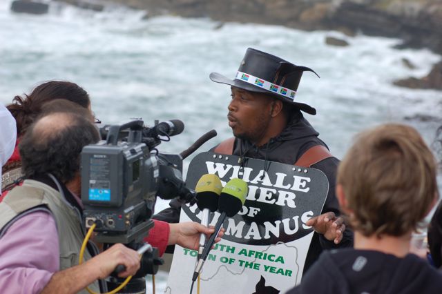 Hermanus takes is whales quite seriously, because they are the source of a lot of tourism for the small town. Since 1992, a Whale Crier, currently Pasika Noboba, has patrolled the shore to announce the presence and location of whales. Mr. Noboba was being interviewed by SABC when I took this photo.