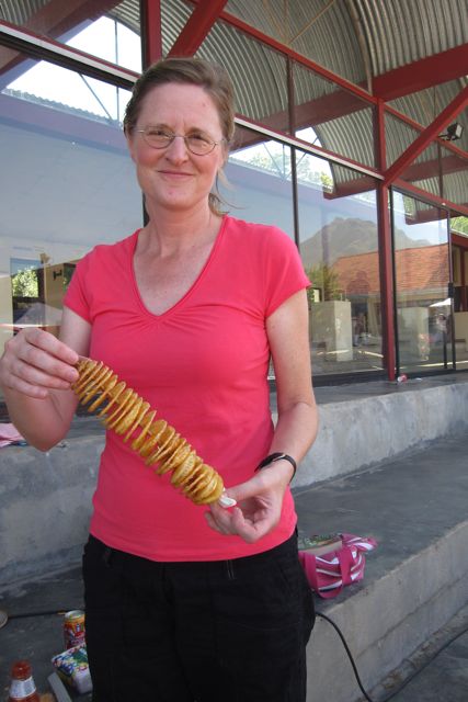Another stall was selling chips on a stick. Tracy had to sample them.